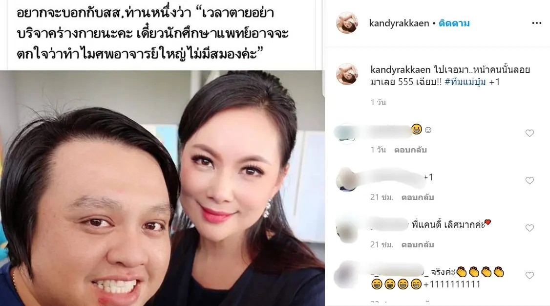 แคนดี้ ได้ทำวงดนตรีพื้นบ้านอีสานร่วมกับบานเย็น รากแก่น มารดาของเธอ โดยมีชื่อวงว่า รากแก่น แฟมิลี่ โพสต์ไอจีกับแฮชแท๊ก #ทีมแม่บุ๋ม มีข้อความในภาพว่า "อยากจะบอก สส. ท่านหนึ่งว่า เวลาตายอย่าบริจาคร่างกายนะคะ เดี๋ยวนักศึกษาแพทย์อาจจะตกใจว่าทำไมศพอาจารณ์ใหญ่ไม่มีสมอง"