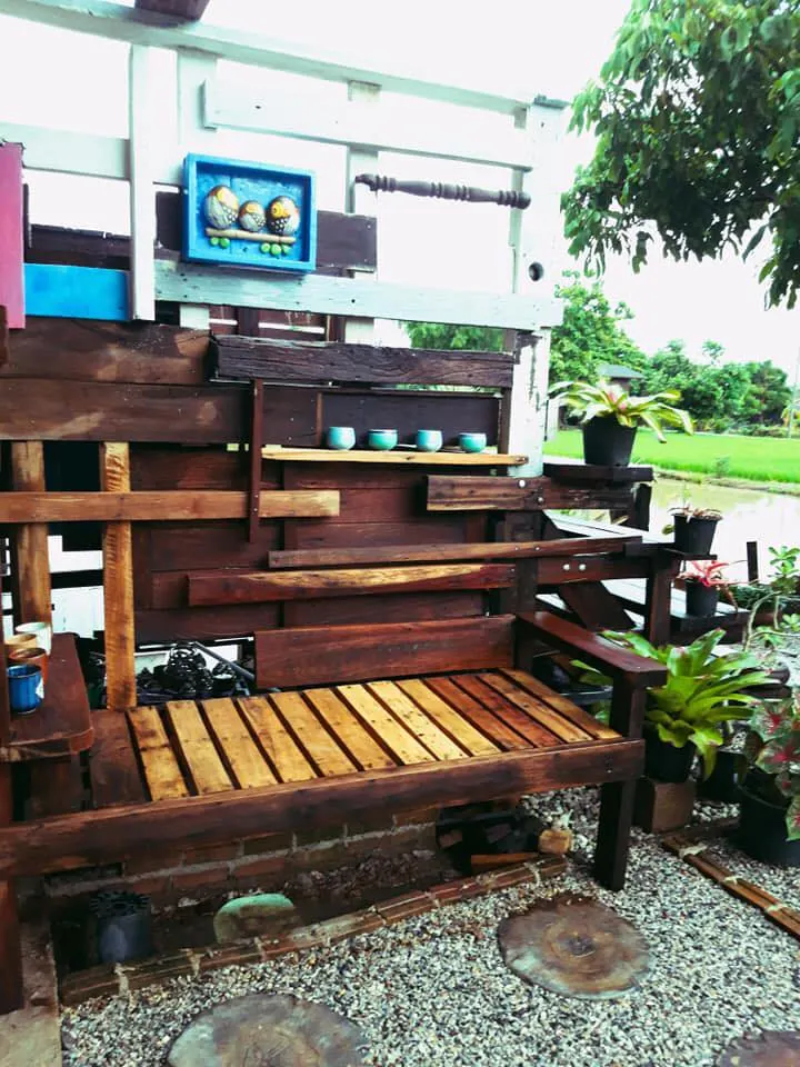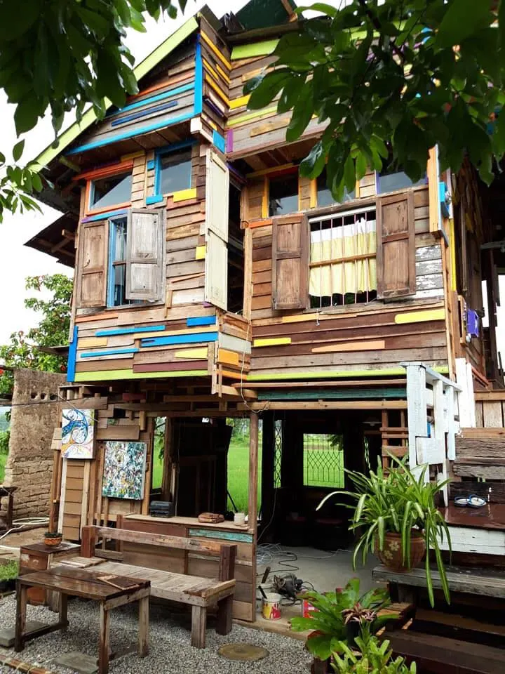 ไอเดียสร้างสรรค์ บ้านไม้สองชั้น สร้างจากเศษไม้ต่อๆ กันทาด้วยสีน้ำมันสีสเปย์ สีสันสวยงาม