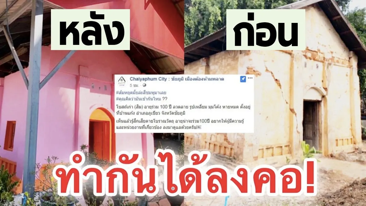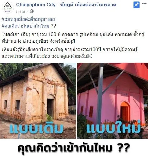 ด้านเพจเฟซบุ๊กชื่อ Chaiyaphum City : ชัยภูมิ เมืองต้องห้ามพลาด ได้แชร์ภาพพร้อมข้อความดังกล่าว เรียกร้องให้หน่วยงานที่เกี่ยวข้องเข้ามาดูแล เนื่องจากโบสถ์เก่าแห่งนี้เป็นโบราณสถานที่มีอายุร่วม 100 ปี มีร่องรอยสถาปัตยกรรมอีสาน รูปเหลี่ยม มุมโค้ง แต่มาถูกทาสีใหม่กลบความงดงามดั้งเดิมไปจนหมดสิ้น เห็นแล้วแทบล้มทั้งยืน