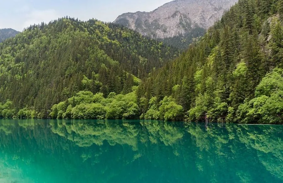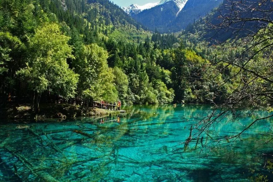ทะเลสาบจิ่วไจ้โกวที่มีชื่อเสียงที่สุดคือทะเลสาบห้าฟลาวเวอร์หรือที่เรียกว่าทะเลสาบหวู่ฮัว มันเป็นทะเลสาบหลายสี ตื้น และด้านล่างถูกปกคลุมด้วยลำต้นของต้นไม้โบราณที่ร่วงหล่น