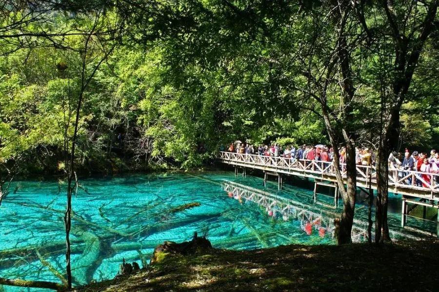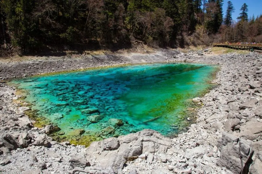 Five-Color Pond เป็นหนึ่งในทะเลสาบที่เล็กที่สุดในจิ่วไจ้โกว แม้จะมีขนาดและความลึกที่พอเหมาะ แต่ก็มีภูมิทัศน์ใต้น้ำที่อุดมสมบูรณ์พร้อมกับน้ำที่สว่างและใสที่สุดในพื้นที่