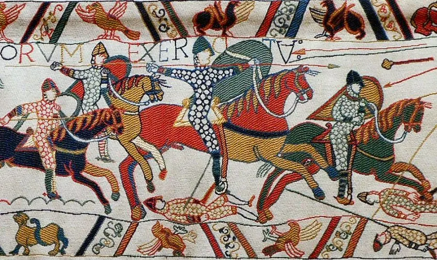 ในพิพิธภัณฑ์แห่งหนึ่งในบาเยอในนอร์มังดีเป็นผลงานที่ระลึก ผ้าที่มีความยาว 70 เมตร ปักด้วยรูปและฉากที่เล่าเรื่องราวที่โด่งดังที่สุดในประวัติศาสตร์อังกฤษ การพิชิตนอร์มันในศตวรรษที่ 11 โดยวิลเลียม ยุคแห่งนอร์มังดีที่กลายมาเป็นราชาแห่งอังกฤษใน ปี ค.ศ. 1066 หลังจากการต่อสู้ของเฮสติ้งส์ พรม Bayeux ถูกสร้างขึ้นในไม่ช้าหลังจากการต่อสู้และบอกเล่าเรื่องราวจากมุมมองของผู้ชนะ น่าแปลกที่ผ้าม่านไม่ได้ทำที่ฝรั่งเศส แต่อยู่ที่อังกฤษ