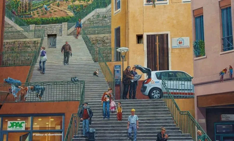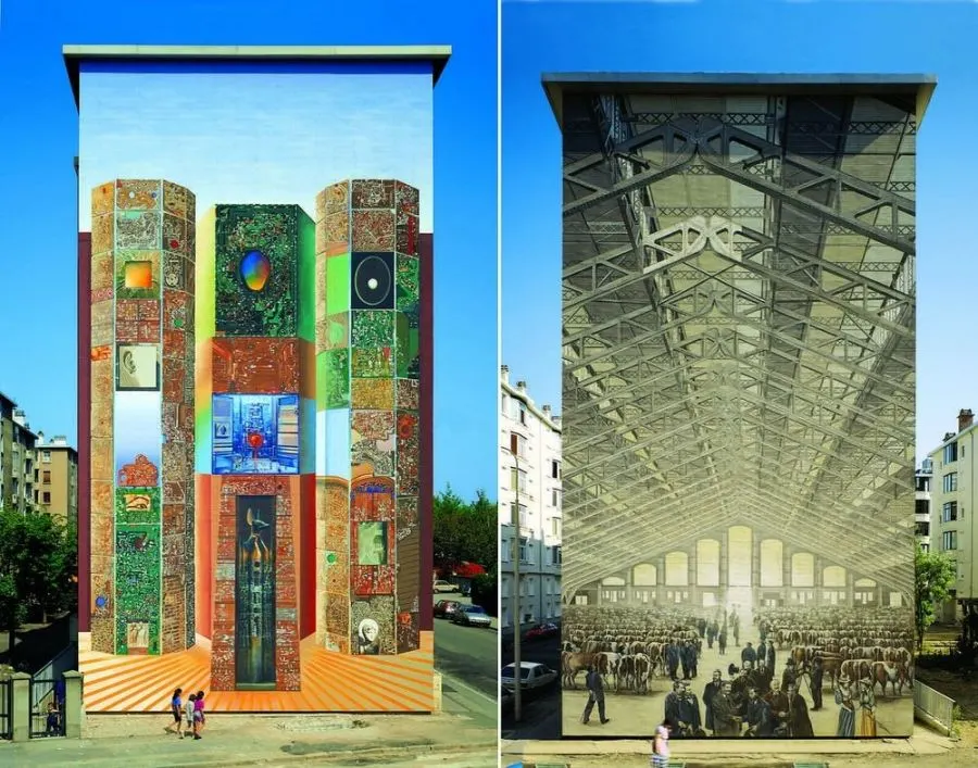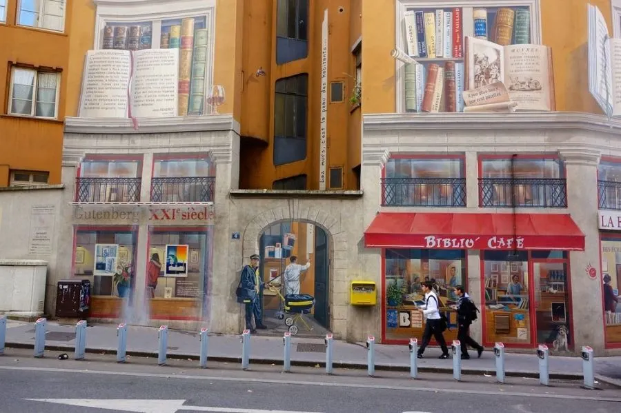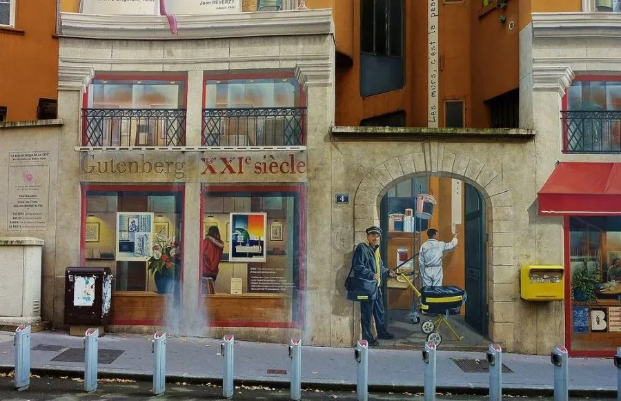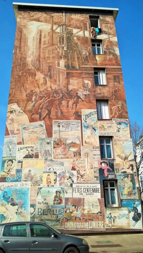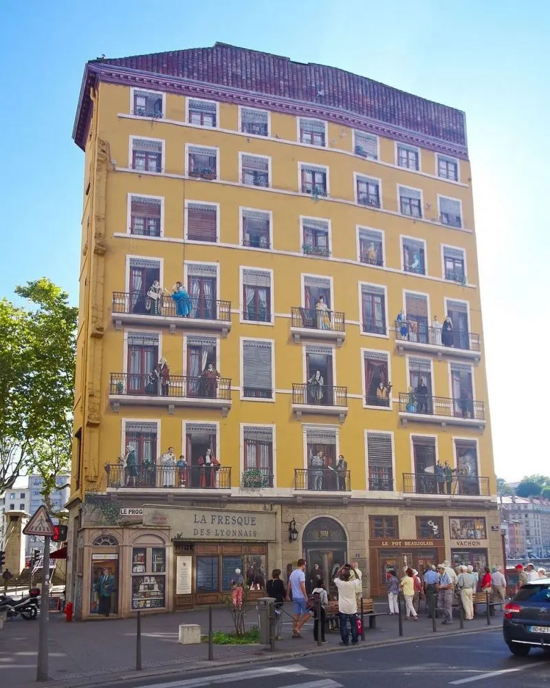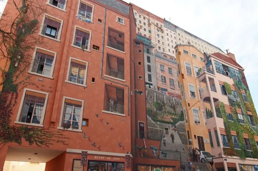 ในช่วงสี่ทศวรรษที่ผ่านมากลุ่มจิตรกรรมฝาผนังในเมืองลียงของฝรั่งเศสได้เปลี่ยนเมืองให้เป็นแกลเลอรีศิลปะกลางแจ้งขนาดใหญ่ ภาพจิตรกรรมฝาผนังขนาดใหญ่ที่ทาสีในสไตล์ทรอมป์ l'oeil ครอบคลุมผนังทั่วลียงที่แสดงถึงเหตุการณ์ทางประวัติศาสตร์หรือบุคคลที่มีชื่อเสียงหรือช่วงเวลาแห่งโลกีย์ในชีวิตประจำวัน ณ ตอนนี้มีภาพจิตรกรรมฝาผนังมากกว่า 150 ภาพทั่วลียง