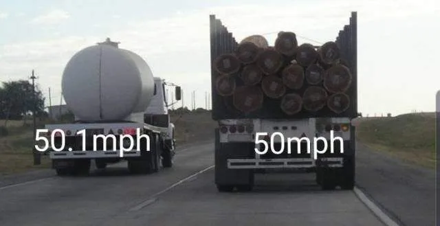 1 เมื่อรถบรรทุกพยายามจะแซงกัน ด้วยความเร็วที่เกือบจะเท่ากัน (ไม่ต้องไปไหนกันพอดีเห้อ)
