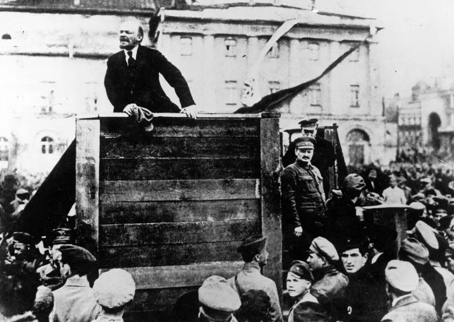 5.วลาดิมีร์เลนินผู้นำการปฏิวัติรัสเซียกล่าวปราศรัยกับทหารกองทัพแดงที่ออกเดินทางไปด้านหน้าในช่วงสงครามโปแลนด์ - โซเวียตที่จัตุรัส Sverdlov (ปัจจุบันคือจัตุรัสเธียเตอร์) ในกรุงมอสโกเมื่อวันที่ 5 พฤษภาคม 1920 ที่ด้านขวาของแท่นเป็น ผู้บังคับการตำรวจ Leon Leon ทรอทสกี้และ Politburo สมาชิก Lev Kamenev