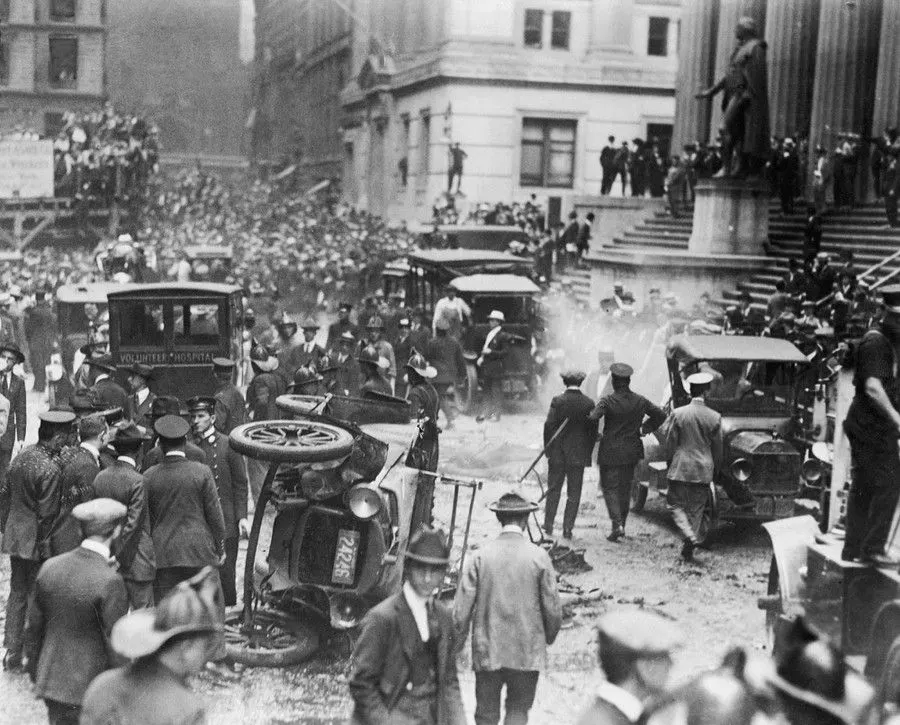 15.คำบรรยายใต้ภาพต้นฉบับ: "การระเบิดของวอลล์สตรีท, 16 กันยายน 2463, สามสิบตาย" อีกแปดในหลายร้อยคนที่ได้รับบาดเจ็บภายหลังเสียชีวิตในโรงพยาบาล ผู้ที่รับผิดชอบในการโจมตีด้วยระเบิดในย่านการเงินของนิวยอร์กไม่เคยถูกระบุแม้ว่าจะมีกลุ่มผู้นิยมอนาธิปไตยและคอมมิวนิสต์หลายคนถูกสงสัยและสอบสวนมาหลายปี