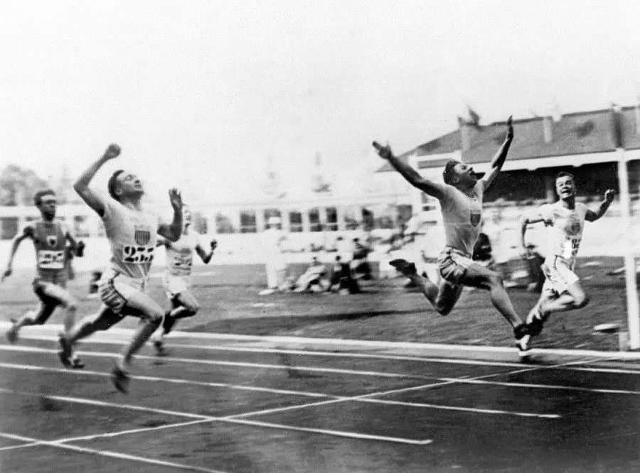 19.คำบรรยายใต้ภาพต้นฉบับ: "Charles (Charley) Paddock ที่สองจากขวาของสหรัฐอเมริกาชนะ 100 เมตรสุดท้ายด้วย 'flying finish' ที่โด่งดังของเขาในโอลิมปิกฤดูร้อนปี 1920 ที่ Antwerp ประเทศเบลเยียม Morris Kirksey ขวาสุดของสหรัฐอเมริกาเป็นที่สอง และ Jackson Scholz จาก USA จากซ้ายเป็นอันดับสี่ "