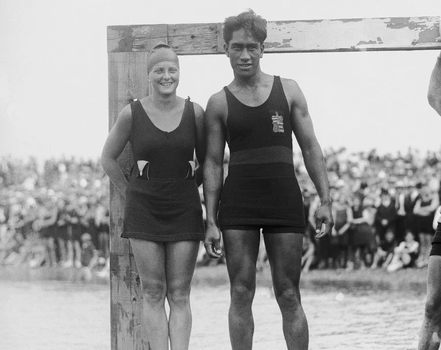 20.นักว่ายน้ำจากทีมสหรัฐอเมริกาถ่ายภาพที่การแข่งขันกีฬาโอลิมปิกที่ 1920 ในแอนต์เวิร์ปเมื่อวันที่ 25 กรกฎาคม 1920 ที่เหลืออยู่คือ Ethelda Bleibtrey จากนิวยอร์กผู้ชนะเหรียญทองสามเหรียญในการแข่งขันและทางขวาคือ Duke Kahanamoku ของฮาวาย