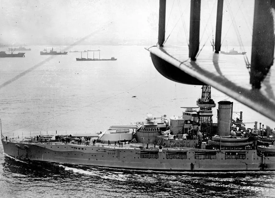 25.มุมมองทางอากาศของเรือรบยูเอสโอคลาโฮมาซึ่ง แต่เดิมสร้างขึ้นในปี 2453 โอกลาโฮมาดำเนินการโดยกองทัพเรือสหรัฐฯจนกระทั่งเธอจมลงในอ่าวเพิร์ลฮาร์เบอร์ฮาวายในเดือนธันวาคม 2484