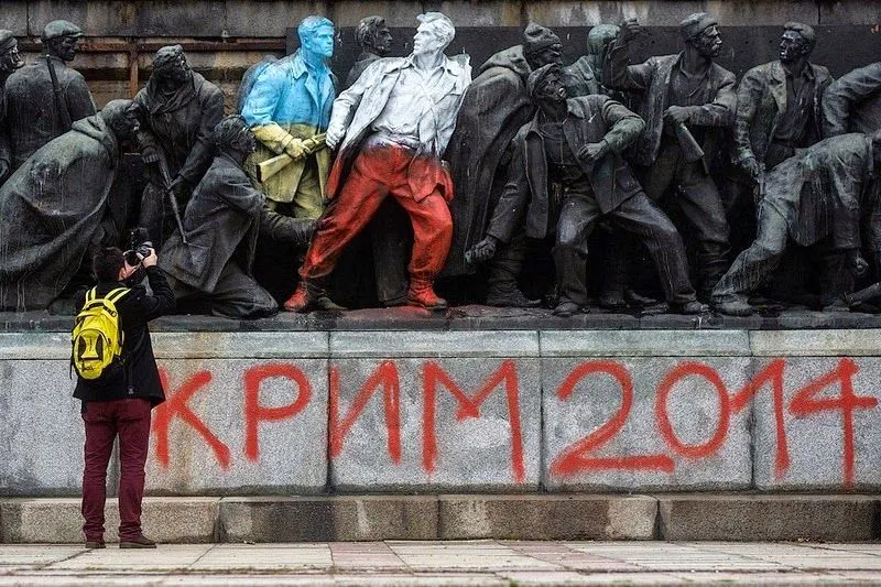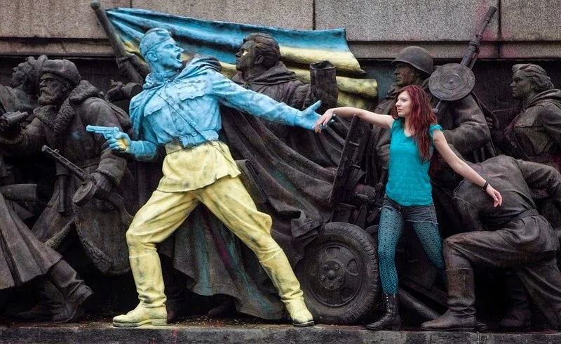 ผู้หญิงโพสท่าถ่ายรูปกับร่างทหารโซเวียตที่ฐานของอนุสาวรีย์กองทัพโซเวียตซึ่งบางส่วนถูกทาสีด้วยธงชาติยูเครนโดยบุคคลที่ไม่รู้จักในโซเฟียเมื่อวันที่ 23 กุมภาพันธ์ 2014 (เครดิตภาพ: REUTERS)