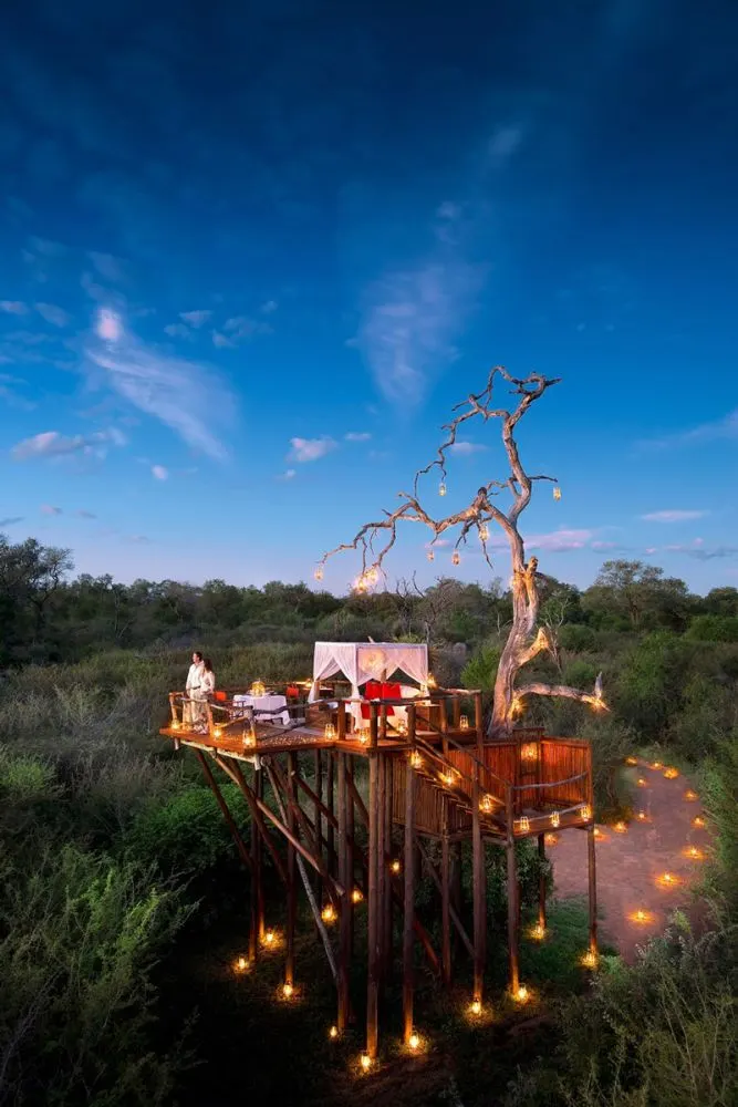 เพื่อความโรแมนติกในป่าไม่มีอะไรสามารถเอาชนะบ้านต้นไม้ที่สวยงามของเขตสงวน Lion Sandsในแอฟริกาใต้ ห่างไกลและหรูหราห้องนอนพุ่มไม้ที่ยกระดับขึ้นบนแพลตฟอร์มนี้เชิญชวนให้แขกนอนใต้แสงดาวและรับประทานอาหารอย่างเป็นส่วนตัวในขณะที่รายล้อมไปด้วยสัตว์ป่าที่น่าตื่นตาตื่นใจที่สุดในโลก