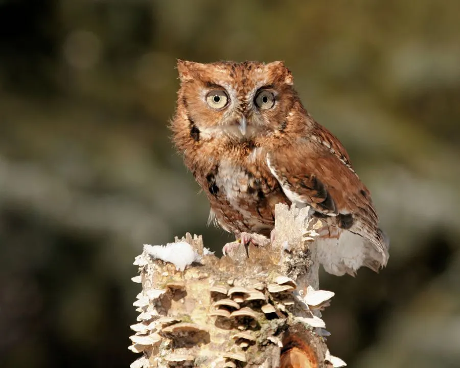 นกเค้าแมวที่มีดวงตากลมโตสีดำขนาดใหญ่และขนที่เป็นเอกลักษณ์ของมัน - เกือบเป็นสีแดง พวกมันจับแมงมุมและแมลงกลางคืน อาศัยอยู่ในแคนาดาและอเมริกาเหนือในฤดูหนาวในฤดูร้อนพวกเขาอพยพไปเม็กซิโกซึ่งสภาพอากาศร้อนกว่า
