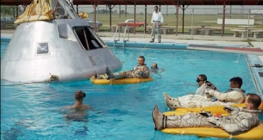 รูปภาพนี้ต้องการคำอธิบายบางอย่างเนื่องจากคุณไม่คาดว่าจะเห็นคนแต่งตัวเต็มยศในสระตามปกติ เห็นได้ชัดว่านี่เป็นส่วนหนึ่งของการฝึกอบรมนักบินอวกาศเพราะพวกเขาจำเป็นต้องรู้วิธีลงจอดในน้ำ การทำงานหนักของวัน