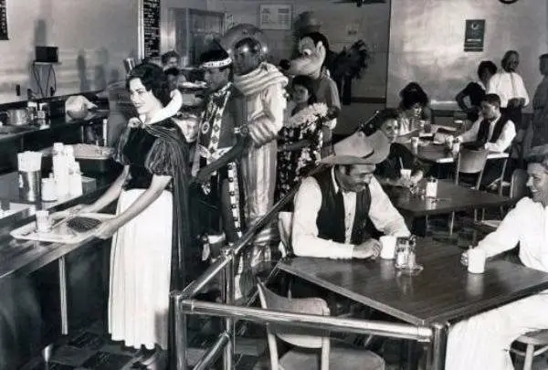 ย้อนกลับไปในวันนักแสดงที่เล่นบทตัวละครของดิสนีย์จะมีปฏิสัมพันธ์กับผู้คนในชุดของพวกเขา ภาพรวมนี้เป็นภาพที่คุณเห็น Snow White, Goofy และตัวละครอื่น ๆ ที่ได้รับอาหารกลางวันในโรงอาหาร