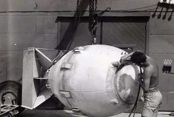 เรารู้ว่า Fat Man เป็นชื่อเล่นที่มอบให้กับระเบิดนิวเคลียร์ที่ทิ้งไว้ที่ Nagasaki อันนี้เป็นที่รู้จักในนาม Little Boy และเป็นระเบิดที่ทิ้งไว้ที่ฮิโรชิม่า ภาพนี้ถ่ายก่อนที่จะถูกส่งออกไป