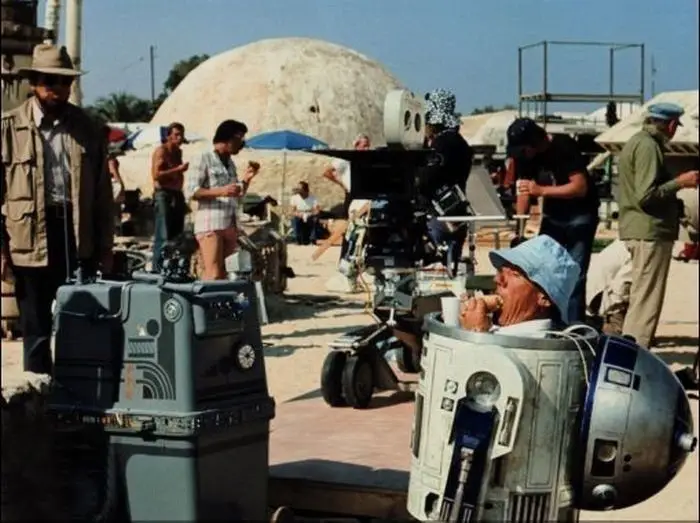 ที่นี่เรามีภาพรวมเล็กน้อยที่เห็นจากด้านหลังฉากการถ่ายทำจากภาพยนตร์ Star Wars ตอนต้น ทีมงานและทีมงานพักทานอาหารกลางวันและเราได้เห็นชายผู้อยู่เบื้องหลังเครื่องแต่งกาย R2D2 ที่เพิ่งออกมาและเพลิดเพลินกับแซนด์วิช