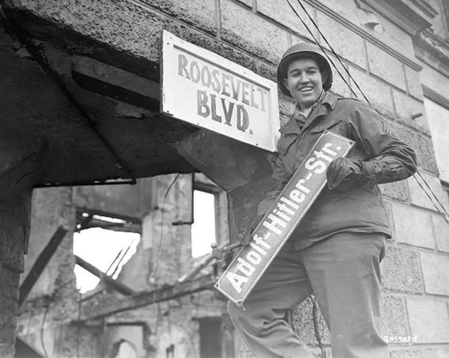 ภาพถ่ายนี้ถูกจัดวางในปี 2488 และแสดงให้เห็นทหารอเมริกันที่ Adolf Hitler Street และแทนที่ด้วยรูปภาพที่บอกว่า Roosevelt Boulevard เพื่อเป็นเกียรติแก่ความช่วยเหลือของอเมริกาในการปลดปล่อยโลกแห่งการก่อการร้ายของฮิตเลอร์