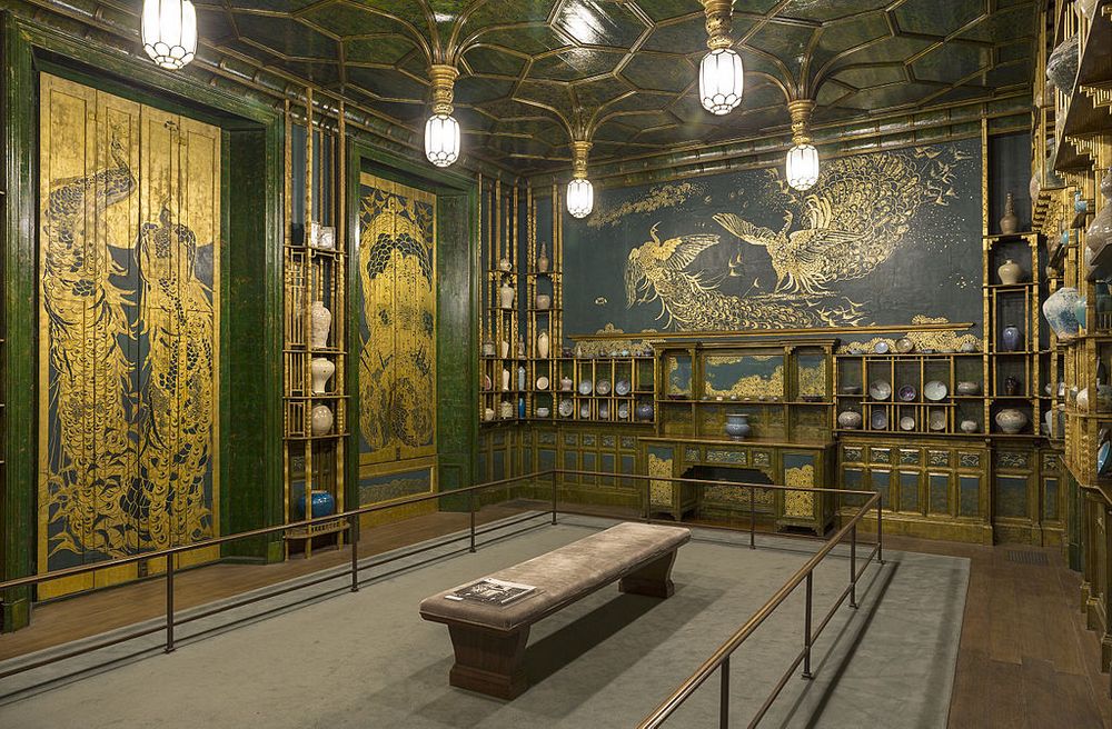 โดยลำพังวิสต์เลอร์ก็เริ่มใช้สิทธิเสรีภาพเพียงเล็กน้อยกับห้องอาหาร เขาครอบคลุมห้องทั้งห้องจากเพดานถึงผนังด้วยโลหะดัตช์หรือแผ่นทองคำเปลวเทียมซึ่งเขาวาดลวดลายขนนกยูงอันเขียวชอุ่ม จากนั้นเขาก็ปิดทองชั้นวางของ Jeckyll ของวอลนัทและประดับประดาบานประตูหน้าต่างไม้ที่มีสี่นกยูงขนนกอย่างสง่างาม