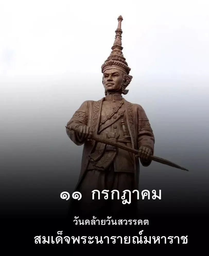 ๑๑ กรกฎาคม พุทธศักราช ๒๕๖๓ เนื่องในวันคล้ายวันสวรรคต สมเด็จพระนารายณ์มหาราช พระมหากษัตริย์ไทยรัชกาลที่ ๒๘ แห่งกรุงศรีอยุธยา สมเด็จพระนารายณ์มหาราช เสด็จพระราชสมภพ เมื่อวันจันทร์ที่ ๑๖ กุมภาพันธ์ ๒๑๗๕ เป็นพระราชโอรสในสมเด็จพระเจ้าปราสาททอง พระมหากษัตริย์ไทยรัชกาลที่ ๒๕ แห่งกรุงศรีอยุธยา หลังจากสมเด็จพระศรีสุธรรมราชา รัชกาลที่ ๒๗ แห่งกรุงศรีอยุธยา ครองราชสมบัติได้ ๒ เดือนเศษ สมเด็จพระนารายณ์ได้ทำการยึดอำนาจ การต่อสู้ยึดอำนาจเกิดขึ้นค่อนข้างรุนแรงในตอนเย็นวันหนึ่งในปี ๒๑๙๙ จนถึงเช้าของวันรุ่งขึ้น ไพร่พลของทั้งสองฝ่ายล้มตายลงเป็นจำนวนมาก ทั้งสมเด็จพระศรีสุธรรมราชาและพระนารายณ์ต่างได้รับบาดเจ็บจากกระสุนปืน สมเด็จพระศรีสุธรรมราชาสู้ไม่ได้จึงถอยหนีไปวังหลังแต่ถูกพระนารายณ์จับกุมตัวและนำไปสำเร็จโทษที่วัดโคกพระยา จากนั้นสมเด็จพระนารายณ์มหาราชเสด็จขึ้นครองราชสมบัติ วันที่ ๑๕ ตุลาคม ๒๑๙๙ ขณะมีพระชนมายุ ๒๕ พรรษา ในเดือนพฤษภาคม ๒๒๓๑ เมื่อสมเด็จพระนารายณ์ ประทับ ณ พระที่นั่งสุทธาสวรรค์ พระอาการประชวรก็ทรุดลงอย่างหนักด้วยโรคไอหืด (asthmatic cough) และใกล้สวรรคตนั่นย่อมเป็นโอกาสส่งให้ออกพระเพทราชาชิงกระทำการรัฐประหารในวันที่ ๑๘ พฤษภาคม ๒๒๓๑ โดยมีหลวงสรศักดิ์เป็นกำลังสำคัญ เสริมด้วยม็อบชาวบ้านและชาววัดในเขตเมืองและปริมณฑลเป็นตัวช่วย ตอนนั้นสมเด็จพระนารายณ์ ทรงเห็นว่าพระเพทราชาเป็นผู้ใหญ่ จึงมอบหมายให้ว่าราชการแทน ระหว่างนั้นพระเพทราชาลวงพระอนุชาทั้งสองพระองค์ของสมเด็จพระนารายณ์ คือเจ้าฟ้าน้อยและเจ้าฟ้าอภัยทศว่ามีรับสั่งให้เข้าเฝ้า เมื่อทั้งสองพระองค์เสด็จถึงเมืองลพบุรีก็ถูกหลวงสรศักดิ์จับไปสำเร็จโทษที่วัดทราก ส่วนพระปีย์พระราชโอรสบุญธรรมถูกผลักตกจากชาลาพระที่นั่งสุทธาสวรรค์แล้วกุมตัวไปสำเร็จโทษ เมื่อวันที่ ๑๘ พฤษภาคม ๒๒๓๑ และได้สั่งให้เจ้าพระยาวิชเยนทร์ (คอนสแตนติน ฟอลคอน) เข้ามาพบ เมื่อเจ้าพระยาวิชเยนทร์มาถึงศาลาลูกขุนก็ถูกกุมตัวไปประหารชีวิต เมื่อวันที่ ๕ มิถุนายน ๒๒๓๑ สมเด็จพระนารายณ์เสด็จสวรรคตเมื่อ ๑๑ กรกฎาคม ๒๒๓๑ ณ พระที่นั่งสุทธาสวรรย์ พระนารายณ์ราชนิเวศน์ จังหวัดลพบุรี รวมครองราชสมบัติเป็นเวลา ๓๒ ปี มีพระชนมายุ ๕๖ พรรษา เมื่อจัดการบ้านเมืองสงบแล้วจึงเชิญพระบรมศพสมเด็จพระนารายณ์มาประดิษฐานที่พระที่นั่งสุริยาศน์อมรินทร์ แล้วทำพระราชพิธีปราบดาภิเษก ณ พระที่นั่งสรรเพชญปราสาท เมื่อพระองค์ขึ้นครองราชย์แล้ว ก็ได้ขับไล่กำลังทหารฝรั่งเศสออกไปจากกรุงศรีอยุธย