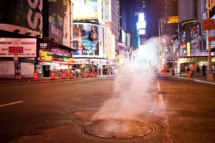 ไอน้ำหนีออกจากท่อระบายน้ำในไทม์สแควร์ตอนดึก (Ramsay de Give สำหรับ The Wall Street Journal)