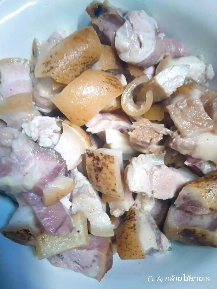 3. นำน้ำตาลทราย เกลือ มาผสมคลุกเคล้ากับเนื้อหมู ใส่หยวกกล้วยเถื่อน(หยวกกล้วยป่า) ตามลงไป และนำไปใส่กระปุกปิดฝาให้มิดชิด ทิ้งไว้ประมาณ 5-7 วัน เราก็จะได้หนางหมูเพื่อนำไปประกอบอาหาร (หนางหมูเป็นการถนอนอาหารอีกชนิดหนึ่งของชาวใต้ค่ะ)