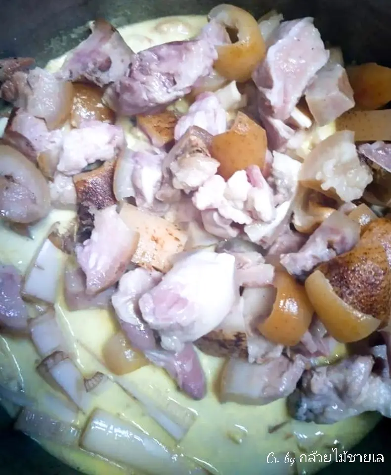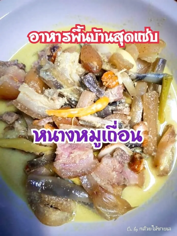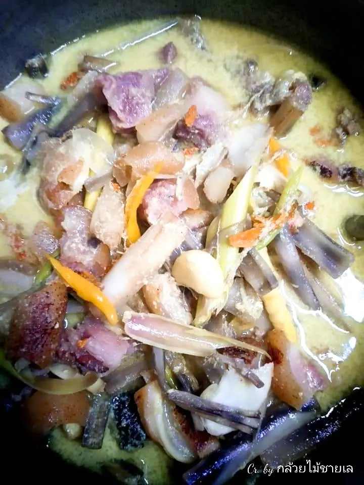 4. นำกะทิสดตั้งไฟปานกลาง หั่นตะไคร้ ข่าลงไป ตำขมิ้น พริกขี้หนูสด กระเทียม หอมแดงที่แกะเปลือกเรียบร้อยแล้วแค่พอแหลก ตักลงใส่หม้อกะทิบนไฟรอจนเดือด จากนั้นตามด้วยหนางหมูเถื่อนจากข้อ 3 ลงไปสมทบ ต้มจนเนื้อหมูสุกเปื่อย ชิมรสก็เป็นอันเสร็จเรียบร้อย