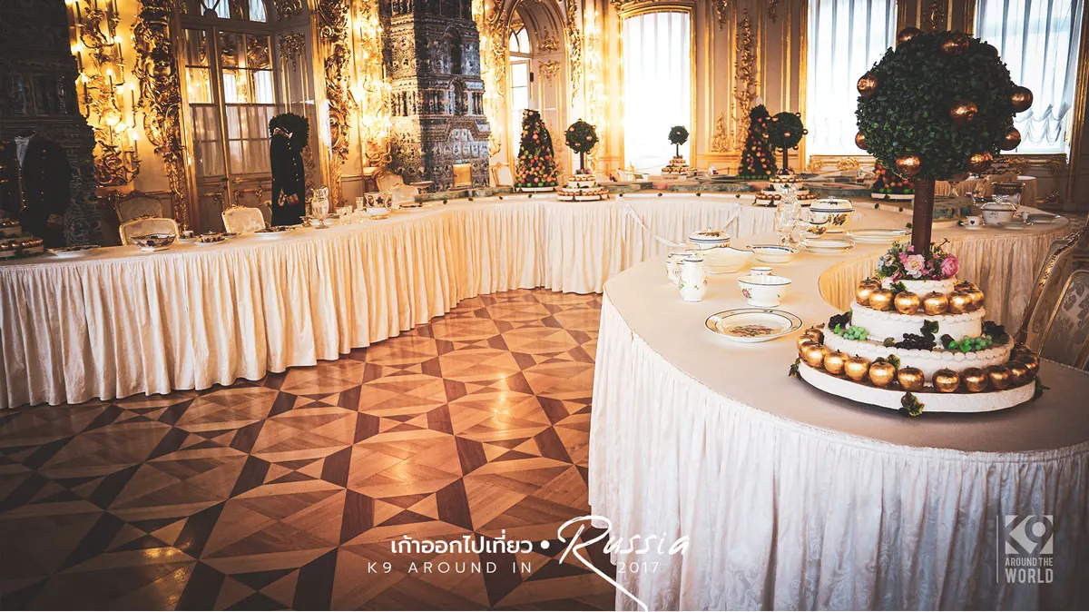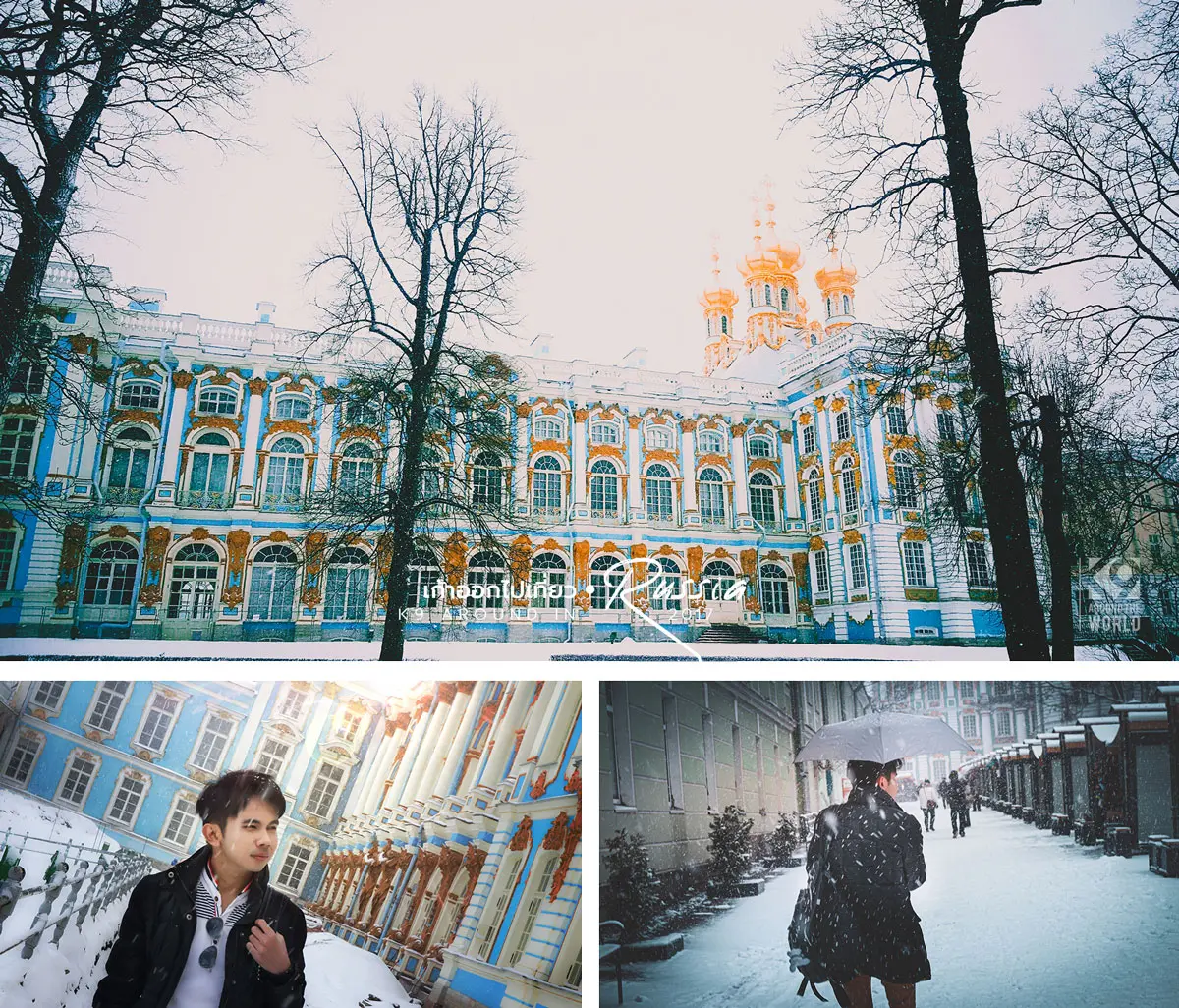 ในวันที่หิมะตกหนัก พระราชวังแคทเธอรีน (Catherine Palace) พระราชวังสีฟ้าแห่งเมือง Pushkin ก็ถูกปกคลุมด้วยหิมะสีขาว การมายืนรอต่อคิวท่ามกลางความหนาวไม่ใช่เรื่องสนุกเลย แต่เมื่อได้เข้าไปข้างในเห็นความงดงามของศิลปะและการตกแต่งแล้วต้องร้องว้าววว.. คุ้มค่ากับการยืนรอ พระราชวังแห่งนี้ถูกสร้างให้เป็นพระราชวังฤดูร้อนของพระนางแคทเธอรีนที่ 1 พระมเหสีของพระเจ้าปีเตอร์มหาราช ปัจจุบันมีการตกแต่งต่อเติมจากเดิมที่เคยถูกทำลายมาหลายยุคหลายสมัย