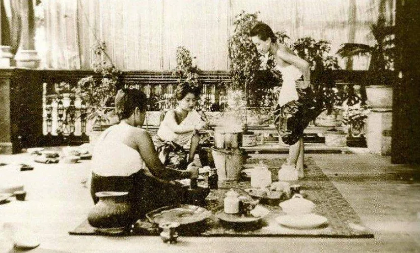 ผู้หญิงในตระกูลบุนนาคกำลังทำอาหารในพระราชวังดุสิต ปี 1898