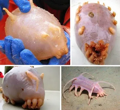 3.Sea Pig หมูทะเลหรือแตงกวาทะเล มีชื่อวิทยาศาสตร์ ว่า Scotoplanes พบได้ตามพื้นมหาสมุทรแปซิฟิก , มหาสมุทรแอตแลนติก และมหาสมุทรอินเดีย?ที่ความลึกมากกว่า 1,000 เมตร เป็นสัตว์ในตระกูล ปลิงทะเล(sea cucumber) ที่มีลักษณะอ้วนกลม ผิวสีชมพู มีปากที่คล้ายจมูกหมู มีระยางที่อยู่บริเวณส่วนท้อง ที่ทำหน้าที่คล้ายขา ใช้ในการคลานบนพื้น สามารถฟองตัวให้ใหญ่ขึ้น จนกลม คล้ายหมู จึงทำให้เป็นที่มาของ หมูทะเล(Sea Pig) อาหารที่มันกินส่วนใหญ่จะเป็นพวกเศษซากพืช ซากสัตว์ ที่ปะปนอยู่ในโคลนของพื้นทะเล