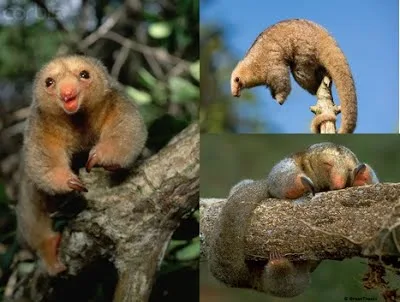 4.Silky Anteater ตัวกินมดแคระมีถิ่นที่อยู่อาศัยที่ป่าดิบชื้นที่ทวีปอเมริกากลางและอเมริกา ใต้ เช่น ประเทศบราซิล และเม็กซิโก เป็นต้น มีชื่อวิทยาศาสตร์ว่า Cyclopes didactylus เป็นตัวกินมดที่มีขนาดเล็กที่สุดมีความสูงเพียง 30 – 40 เซนติเมตร น้ำหนักเพียง 200 – 500 กรัม มีอายุเฉลี่ยแค่ 2 ปี ตัว มีขนสีน้ำตาลทองจมูกสั้น มีหางยาวและแข็งแรงไว้สำหรับพันกิ่งไม้เพื่อปืนปายอย่างง่ายดาย(พวกมันชอบ อาศัยอยู่บนต้นนุ่นมาก) มันมีกรงเล็บเท้าหน้าที่แข็งแรงมาก เพื่อเกาะต้นไม้และป้องกันตัวจากศัตรู ตัวกินหมดแคระมีสายตาไม่ดี แต่มีประสาทการดมกลิ่นและการได้ยินที่ดีมาทดแทนในช่วงเวลากลางคืน ตัวกินมดแคระจะนอนหลับอยู่บนต้นไม้ และออกหากินเวลากลางคืนในหนึ่งคืนมันจะกินมดมากกว่า 8,000 ตัว โดยแลบลิ้นที่ยาวและมีสารเหนียวเข้าในรังมด เจ้ามดโชคร้ายจะติดสารเหนียวๆ ของลิ้นตัวกินมดแคระออกมา หากมันหามดกินไม่ได้ บางครั้งก็จะกินแมลงอื่นๆ เช่น?เต่าทอง เป็นสัตว์รักสันโดษชอบอยู่เพียงลำพังหรือไม่ก็อยู่กับคู่ของมันเท่านั้น