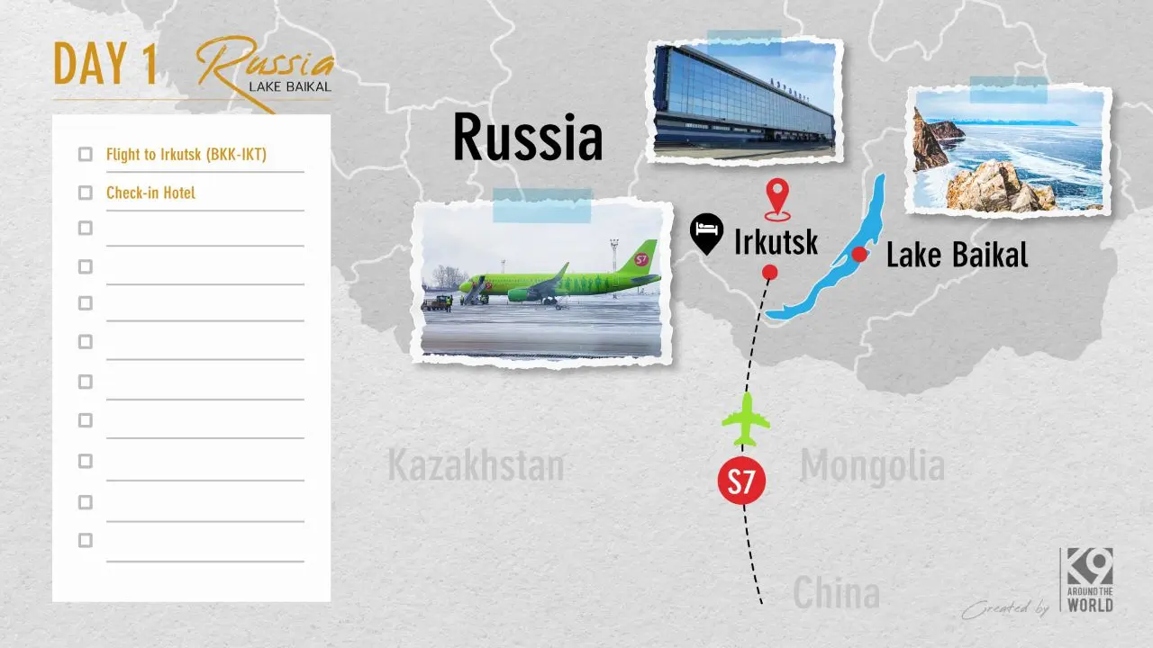 16:35 ออกเดินทางจากสนามบิน Suvarnabhumi สู่เมือง Irkutsk ประเทศรัสเซีย โดยสายการบิน S7 Airline (บินตรง 6 ชม.) 23:45 ถึงสนามบิน Irkutsk (เวลาเร็วกกว่าไทย 1 ชั่วโมง) เข้าสู่โรงแรมที่พักในเมือง Irkutsk โดยทางไกด์ท้องถิ่นจะเป็นคนมารับตั้งแต่ออกจากสนามบิน และดูแลเราไปตลอดทริป