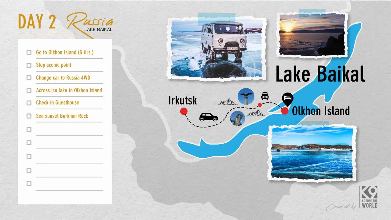 เช้า ออกเดินทางจาก Irkutsk มุ่งหน้าสู่ทะเลสาบไบคาล ใช้เวลาประมาณ 5 ชม. ระหว่างทางสามารถให้ไกด์จอดแวะตามจุดชมวิวต่างๆ ได้ บ่าย เปลี่ยนเป็นรถ Russia 4WD เพื่อข้ามทะเลสาบน้ำแข็งไปอีกประมาณ 30 นาที ถึงเกาะ Olkhon เพื่อเข้าที่พัก แล้วค่อยออกไปชมพระอาทิตย์ตกดินบริเวณ Burkhan Rock Viewpoint