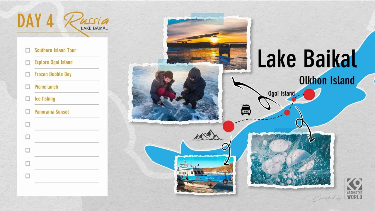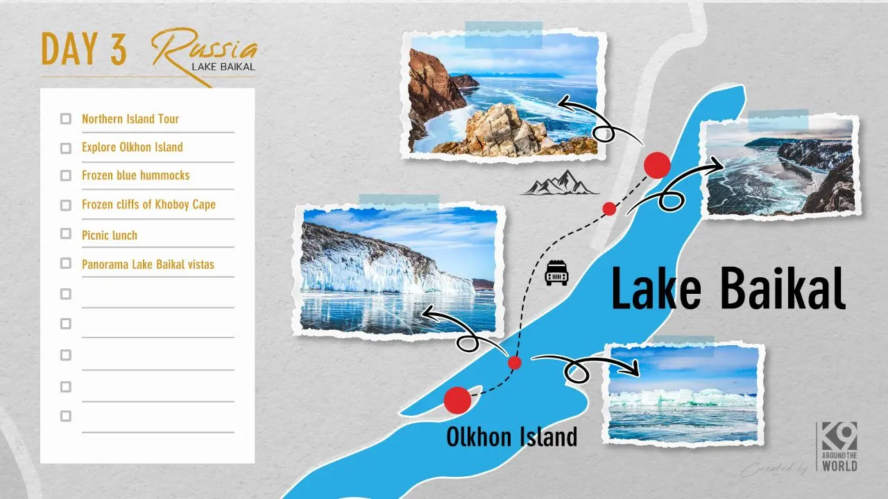 เช้า เที่ยวเกาะเหนือ สำรวจบริเวณเกาะ และลงไปสัมผัสพื้นน้ำแข็งบนทะเลสาบไบคาล ถ้ำน้ำแข็ง กองเนินน้ำแข็งสีฟ้าที่เกิดจากคลื่นน้ำในทะเลสาบ และนั่งรถขึ้นเขาไปทางทิศเหนือของเกาะ เข้าเขตอุทยาน ชมวิวทะเลสาบในแบบพาโนรามา บ่าย ปิคนิคทำอาหารในบรรยากาศธรรมชาติ แวะจุดชมวิวระหว่างทาง ก่อนเดินทางกลับ (เนื่องจากเส้นทางจะค่อนขับรถลำบาก ควรกลับถึงที่พักก่อนพระอาทิตย์ตกดิน)