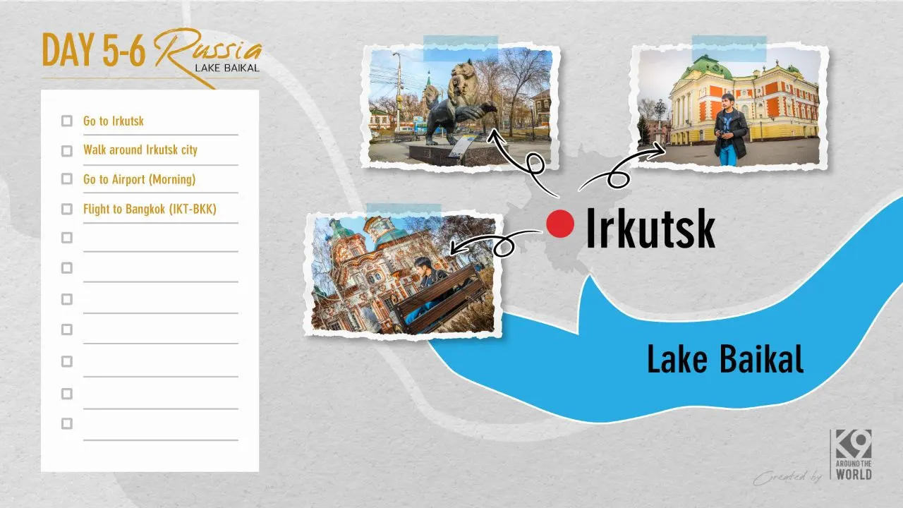 เช้า ออกจากเกาะ Olkhon เพื่อกลับเข้าสู่เมือง Irkutsk ใช้เวลาประมาณ 5 ชม. บ่าย เข้าที่พักในเมือง Irkutsk แล้วออกไปเดินเล่นรอบๆ เมือง Irkutsk ซึ่งมีแลนด์มาร์คสำคัญ และห้างสรรพสินค้า อยู่ไม่ไกลกันมาก (สามารถเปิด Map แล้วเดินเที่ยวเองได้)