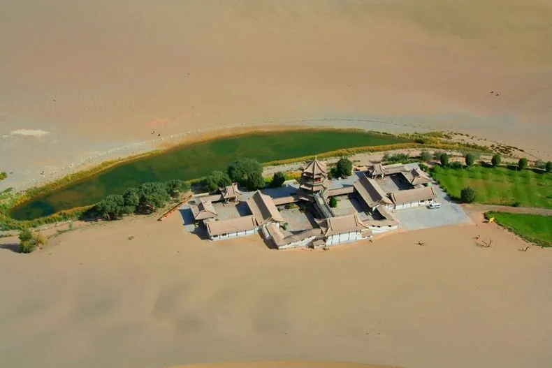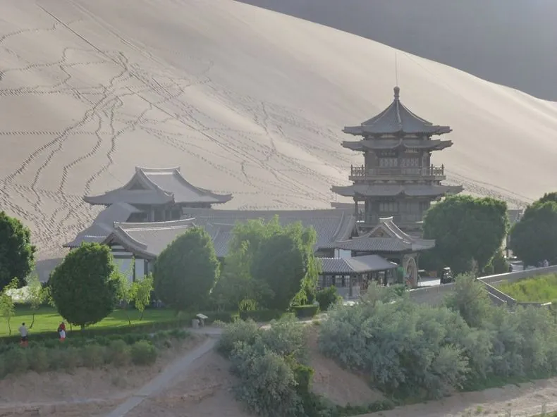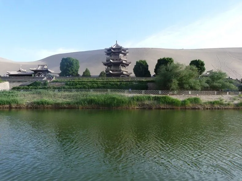 ทะเลสาบเสี้ยวที่เรียกว่า Yueyaquan ในภาษาจีนเป็นทะเลสาบรูปพระจันทร์เสี้ยวที่สวยงามตั้งอยู่ 6 กม. ทางทิศใต้ของเมืองตุนหวงในอ้อมแขนของ Echoing-Sand Dune น้ำของทะเลสาบ Crescent นั้นบริสุทธิ์และใสราวกับอัญมณีมรกตในทราย ด้านข้างของทะเลสาบเครสเซนต์เป็นเจดีย์ในสถาปัตยกรรมจีนฮั่นแบบดั้งเดิม ถนนที่เรียงรายไปด้วยแผงขายของที่ระลึกทอดยาวจากทางเข้าสู่อาคาร นักท่องเที่ยวจำนวนมากขี่อูฐมาที่นี่ เพื่อไปยังจุดสูงสุดของเนินทราย