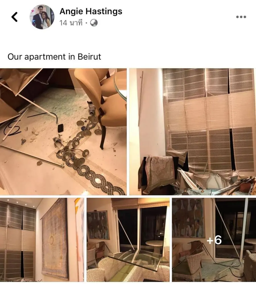 ล่าสุดได้โพสต์ภาพอพาร์ตเม้นต์ของตัวเอง ผ่านFacebookส่วนตัว ในสภาพยับเยินหลังโดนรัศมีแรงระเบิด ครั้งใหญ่ในรอบปี! ณ กรุงเบรุต ประเทศเลบานอน!!