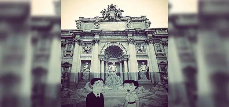 Family Guy สร้างโดยและนำแสดงโดย Seth MacFarlane มีรูปแบบการเล่าเรื่องที่ใช้ฉากตัดแบบสุ่มที่ทำให้ทุกตอนมีการตั้งค่ามากมายนับไม่ถ้วน ตัวอักษรด้านบนมีให้เห็นด้านหน้าน้ำพุเทรวีซึ่งเป็นน้ำพุสไตล์บาโรกที่ใหญ่ที่สุดในกรุงโรมประเทศอิตาลี พวกเขาทำได้ดีมากในการสร้างโครงสร้างที่มีชื่อเสียงขึ้นมาใหม่