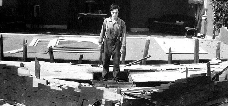 Buster Keaton เป็นหนึ่งในนักแสดงคนแรกในประวัติศาสตร์ภาพยนตร์ที่เสี่ยงชีวิตแสดงฉากผาดโผนที่อันตราย เขาอาจเสียชีวิตหลายครั้ง แต่เหตุการณ์ที่เป็นสัญลักษณ์ที่สุดของการยิงที่ท้าทายความตายเกิดขึ้นระหว่างการถ่ายทำ Steamboat Bill Jr. ในปี 1928 ซึ่งเป็นฉากที่สร้างขึ้นใหม่ แต่ไม่เคยตรงกัน เขายืนอยู่ด้านข้างของบ้านทั้งหลังล้มลงรอบตัวเขา หากเขาขยับไปในทิศทางใด ๆ เขาจะถูกบดขยี้