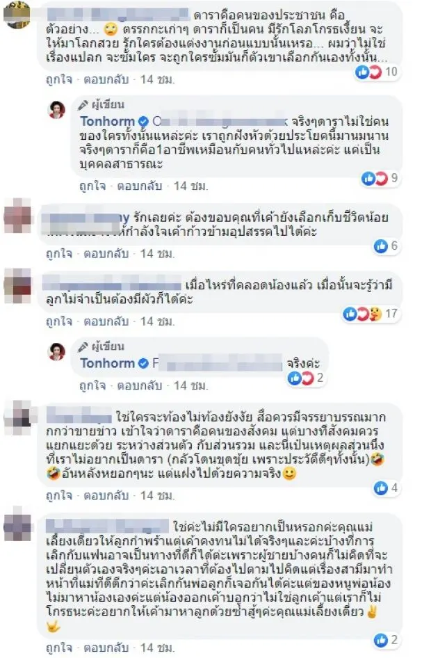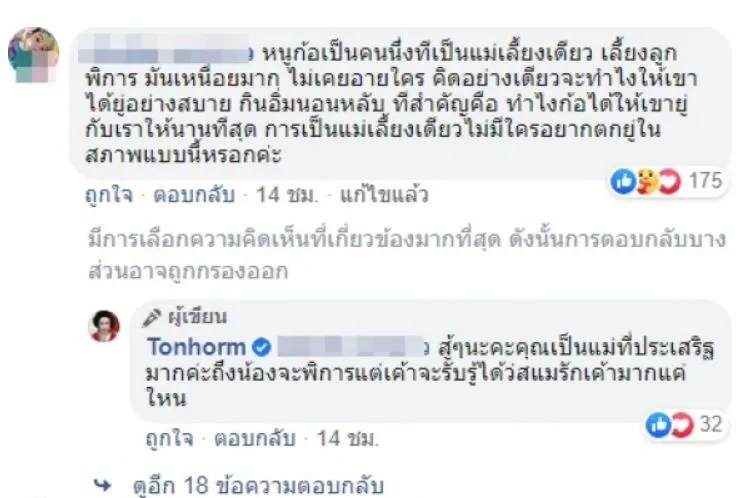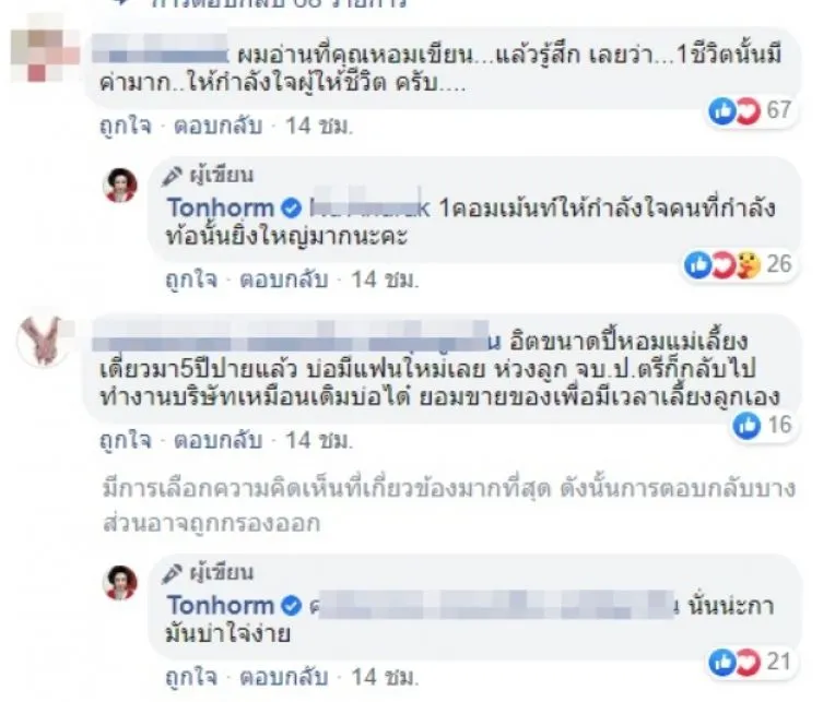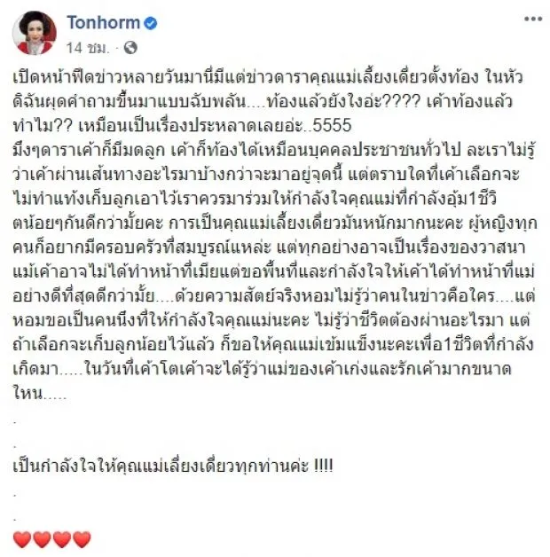 ด้วยความสัตย์จริงหอมไม่รู้ว่าคนในข่าวคือใคร….แต่หอมขอเป็นคนนึงที่ให้กำลังใจคุณแม่นะคะ ไม่รู้ว่าชีวิตต้องผ่านอะไรมา แต่ถ้าเลือกจะเก็บลูกน้อยไว้แล้ว ก็ขอให้คุณแม่เข้มแข็งนะคะเพื่อ1ชีวิตที่กำลังเกิดมา…..ในวันที่เค้าโตเค้าจะได้รู้ว่าแม่ของเค้าเก่งและรักเค้ามากขนาดใหน…..เป็นกำลังใจให้คุณแม่เลี่ยงเดี่ยวทุกท่านค่ะ !!!!”
