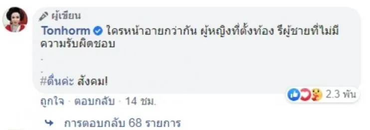 พร้อมทิ้งท้ายแซ่บๆ ว่า “ใครหน้าอายกว่ากัน ผู้หญิงที่ตั้งท้อง รึผู้ชายที่ไม่มีความรับผิดชอบ #ตื่นค่ะ สังคม!”