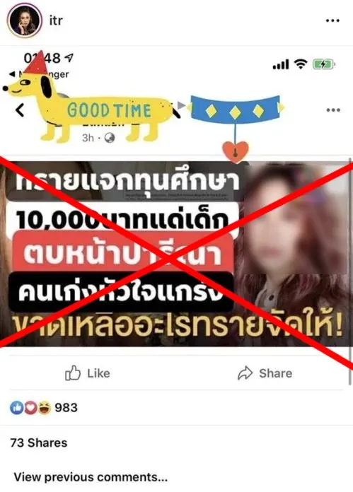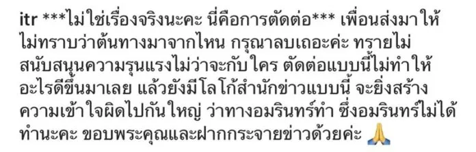 “***ไม่ใช่เรื่องจริงนะคะ นี่คือการตัดต่อ*** เพื่อนส่งมาให้ ไม่ทราบว่าต้นทางมาจากไหน กรุณาลบเถอะค่ะ ทรายไม่สนับสนุนความรุนแรงไม่ว่าจะกับใคร ตัดต่อแบบนี้ไม่ทำให้อะไรดีขึ้นมาเลย แล้วยังมีโลโก้สำนักข่าวแบบนี้ จะยิ่งสร้างความเข้าใจผิดไปกันใหญ่ ว่าทางอมรินทร์ทำ ซึ่งอมรินทร์ไม่ได้ทำนะคะ ขอบพระคุณและฝากกระจายข่าวด้วยค่ะ 🙏”