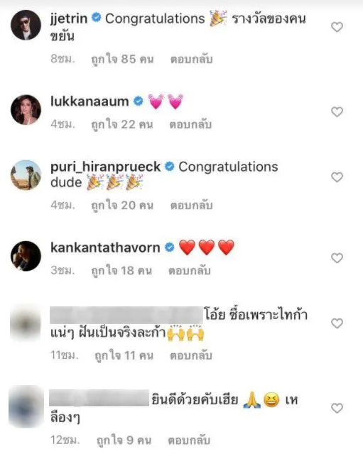 ทำเอาเพื่อน พี่น้องคนบันเทิงเข้ามาคอมเมนต์ชื่นชมสนั่นเลยว่า Congratulations 🎉 รางวัลของคนขยัน , 💓💓 ,Congratulations dude 🎉🎉🎉,❤️❤️❤️ ,โอ้ย ซื้อเพราะไทก้าแน่ๆ ฝันเป็นจริงละก้า🙌 ,ยินดีด้วยคับเฮีย 🙏😆 เหลืองๆ