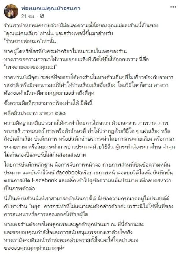 -ตอนนี้ทางครอบครัวเค้าออกมาปกป้องตัวเอง เพจนี้เป็นเพจขายของของแม่พี่ม้า ทำเพื่อขายห่อหมกเท่านั้น.. ใครที่โจมตี ทำให้ร้านเสื่อมเสียชื่อเสียง เค้าจะดำเนินคดีนะ