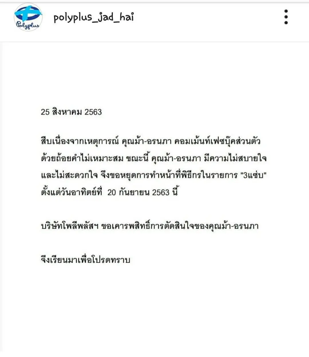 โพลิพลัสออกจดหมายมาอย่างเป็นทางการ ชี้แจงเรื่อง "ม้า อรนภา" หลุดจาก "3แซ่บ"