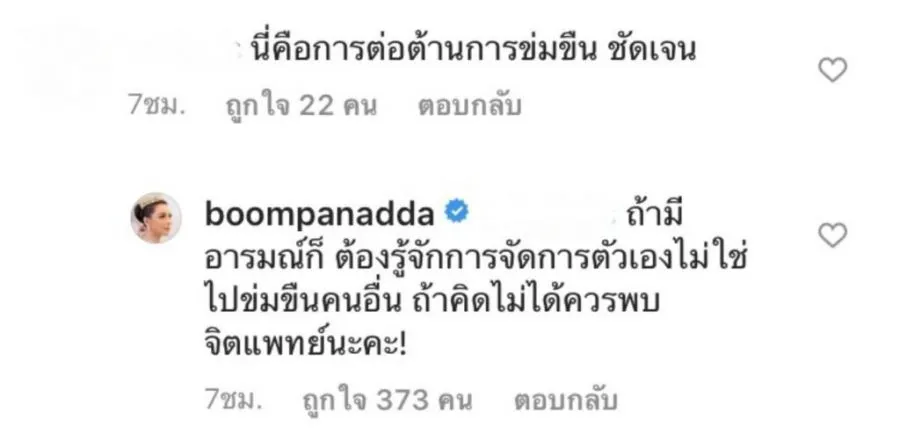 ซึ่งบุ๋มก็ได้เข้ามาตอบคอมเมต์ดังกล่าวว่า “ถ้ามีอารมณ์ก็ ต้องรู้จักการจัดการตัวเองไม่ใช่ไปข่มขืนคนอื่น ถ้าคิดไม่ได้ควรพบจิตแพทย์นะคะ!