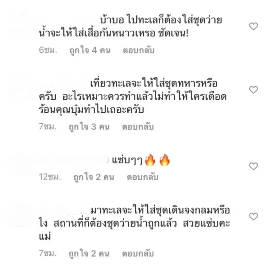 รวมถึงคนอื่นๆ ที่เข้ามาแสดงความคิดเห็นว่าการใส่ชุดว่ายน้ำไม่เกี่ยวกับการต่อต้านการข่มขืนแต่อย่างใด เช่นคอมเมนต์ต่างๆ เหล่านี้ที่เห็นด้วยกับ บุ๋ม ปนัดดา