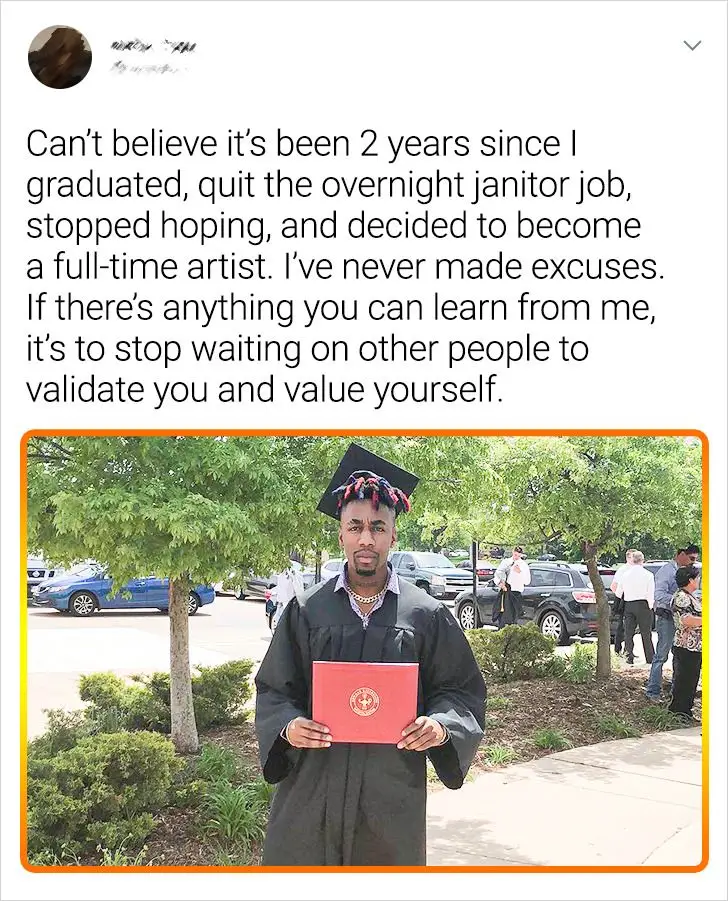 - พ่อเลี้ยงของฉันเป็นผู้ชายธรรมดา เขาทำงานตัดเย็บหมวกและขับรถรับจ้าง วันหนึ่งเขาพบสีในบ้านและเริ่มทำภาพวาดสมัยใหม่ คุณยังคิดว่าสายเกินไปที่จะเริ่มทำในสิ่งที่คุณชอบมั้ย © mementomorrigan / ทวิตเตอร์