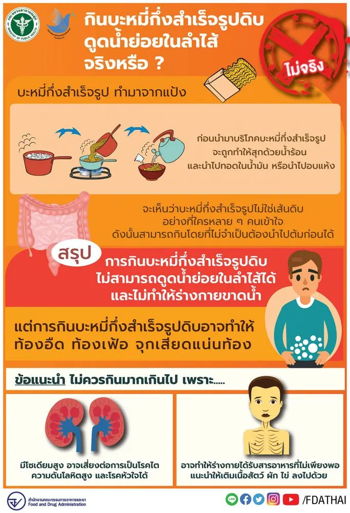 บางคนอาจเคยอ่าน หรือเคยได้ยินมาว่า กินบะหมี่กึ่งสำเร็จรูปดิบจะดูดน้ำย่อยในลำไส้ ทำให้เกิดอาการขาดน้ำ จนเกิดภาวะช็อกได้