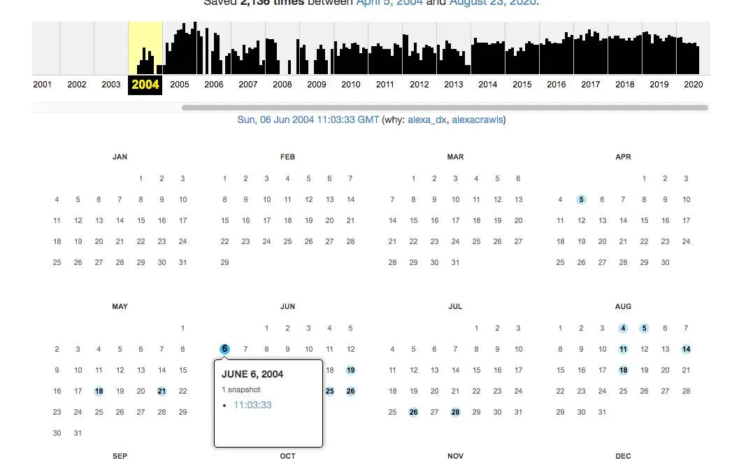 ระบบจะค้นหาหน้าเวปจากสารระบบทั่วโลกในเวลาเพียงไม่กี่วินาที ก็จะพบว่า มีการบันทึกที่สามารถค้นพบได้เก่าสุดคือปี 2004 (โอ้โห เรียกได้ว่าถอยหลังไปถึง 16 ปีกันเลยทีเดียว) ทีนี้ผมก็จะเลือกสักวันนึงของช่วงเวลาปี 2004 ดูนะครับ