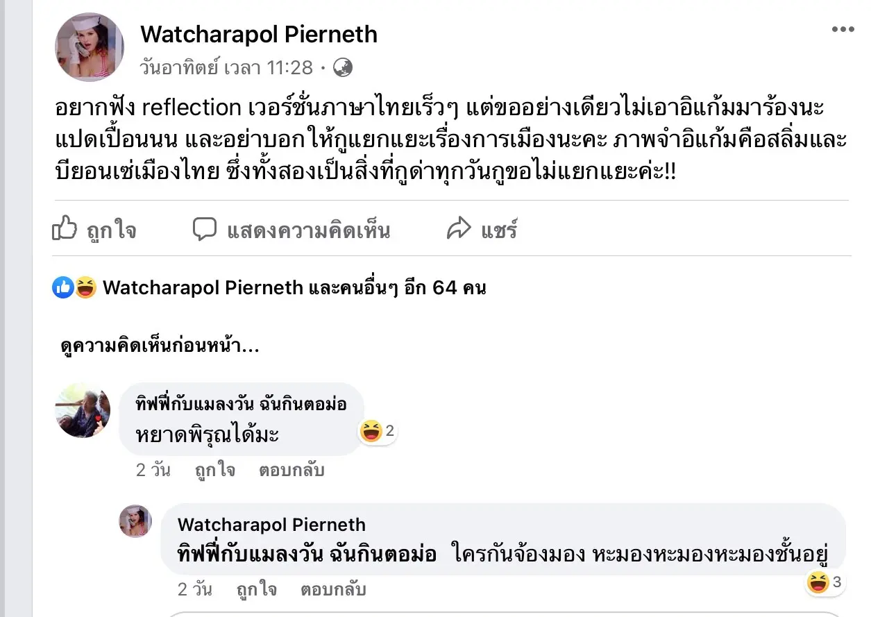 ผู้ใช้เฟสบุ๊ครายหนึ่ง ได้เผลอหลุดพูดออกมาว่า เจนนี่ได้หมดถ้าสดชื่นได้ร้องเพลง reflection อ้างว่าได้ข่าวมา ในระหว่างพูดคุยกันเรื่องใครจะเป็นคนร้องเพลงนี้ในเวอร์ชั่นภาษาไทย. เพลง reflection เป็นเพลงประกอบภาพยนตร์ฟอร์มยักษ์ MULAN จาก ดิสนีย์ ซึ่งในภาษาอังกฤษนั้น ขับร้องโดย Christina Aguilera